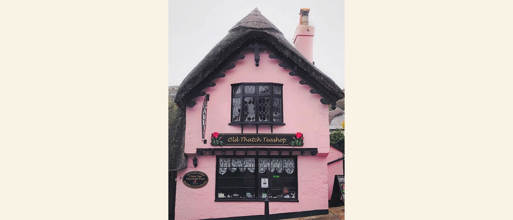 In 1940, after many centuries and many businesses later, the cottages were transformed into the perfectly pink Teashop that stands today. Its proprietors, Pat and Charles, take pride in the shop’s quintessential English offerings and preserving the tea shop’s charm and traditions. Within its rosy exterior, there are three tea rooms adorned in local memorabilia. Tea and homemade English goods are offered beneath the thatched roof which is made of reed — this means if you bring a book, you’ll read under reeds!