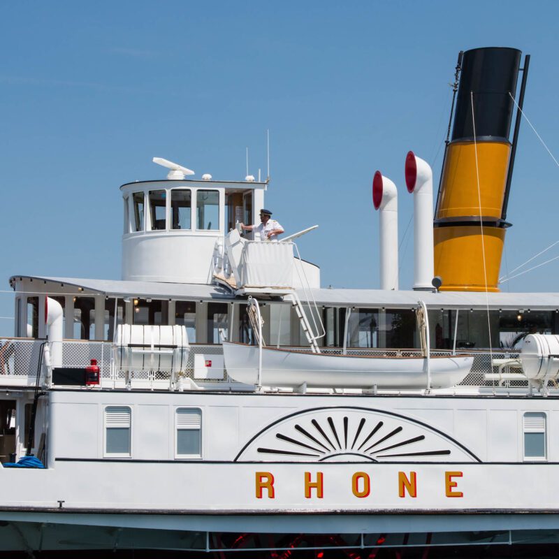 On the crisp waters of Lake Geneva, a bright-white “wedding-cake” of a vessel cruises through the waves of emerald blue.