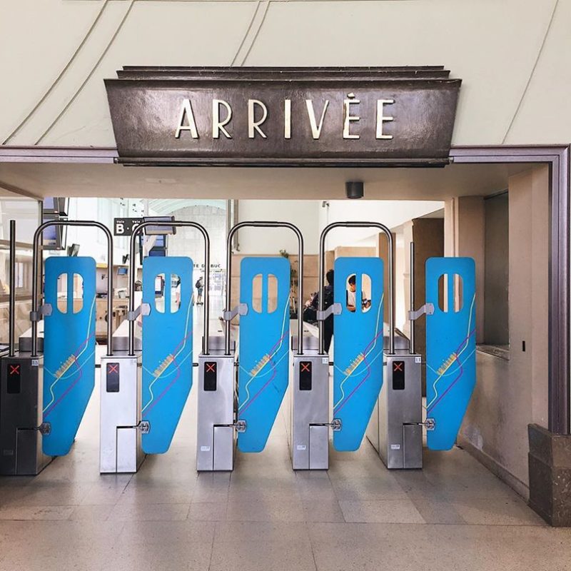 An Art Deco entrance above a row of bright blue swinging turnstiles has welcomed passengers arriving to Versailles-Chantiers in France since 1932.