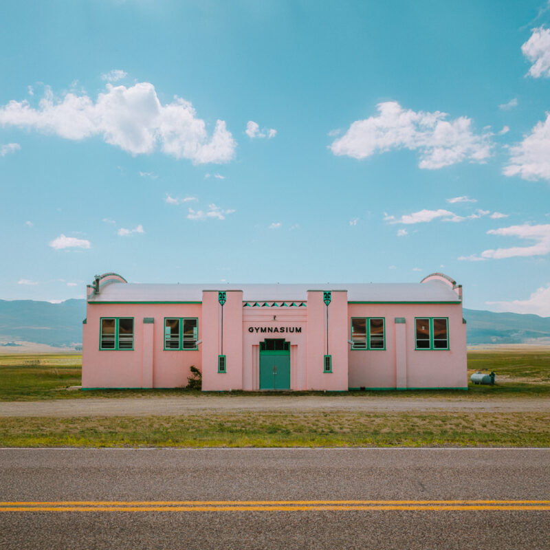 A tiny Prairie-style gymnasium lit by Delco generators until 1951, now a pink relic along Highway 28.