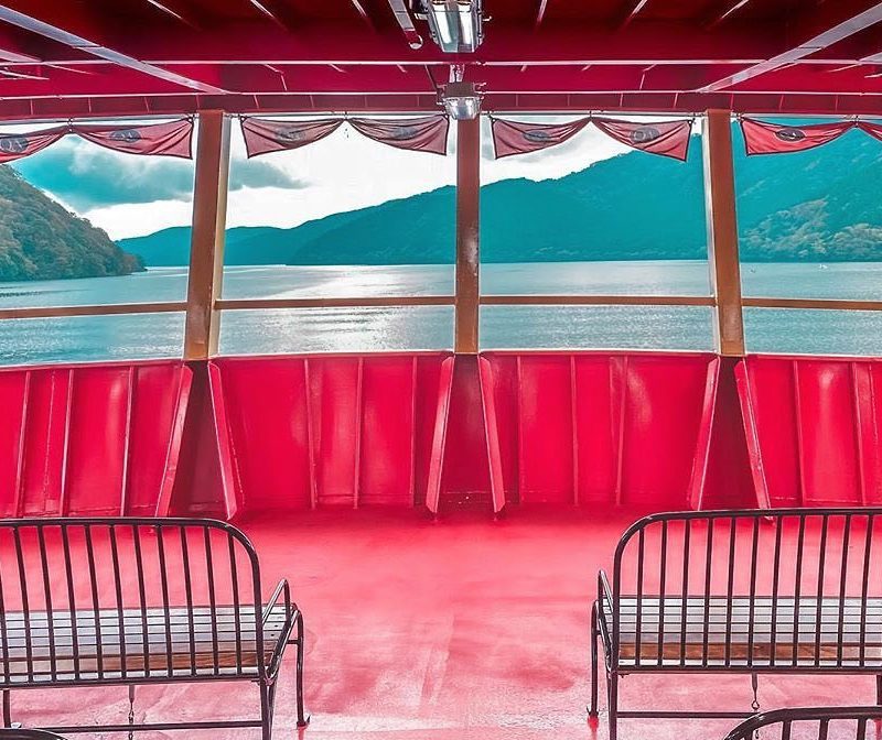 A colorful view from inside a pirate ship on a sightseeing tour on the beautiful Lake Ashi in Japan.