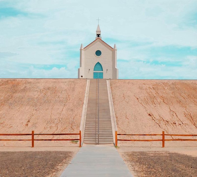 A Parisian skydiver, a staircase from the Eiffel Tower, and a storybook church on a hill—welcome to Felicity, the desert town where whimsy meets wonder.