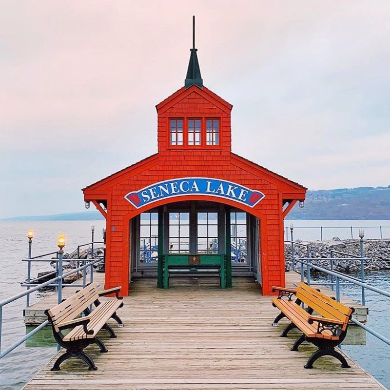 This pier rests on the southern tip of Seneca Lake, one of New York's "Finger Lakes", and is surrounded by a region of sweet wine vineyards.