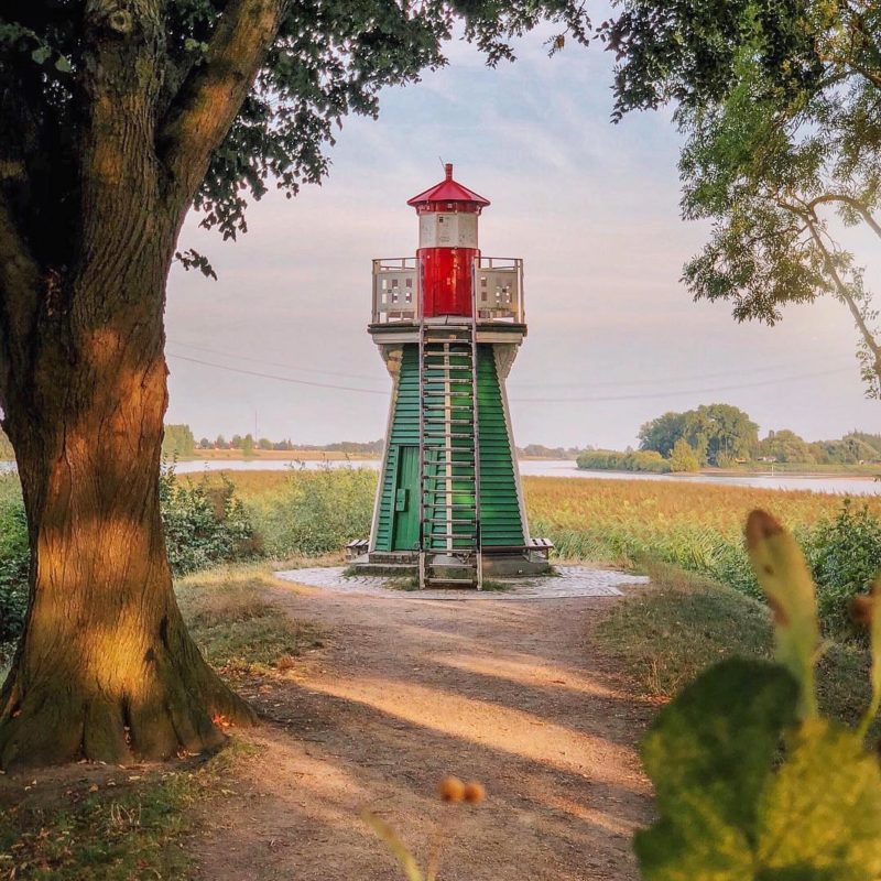 This dreamy lighthouse monitors the flow rate of the branches of the Elbe river in Hamburg, Germany.