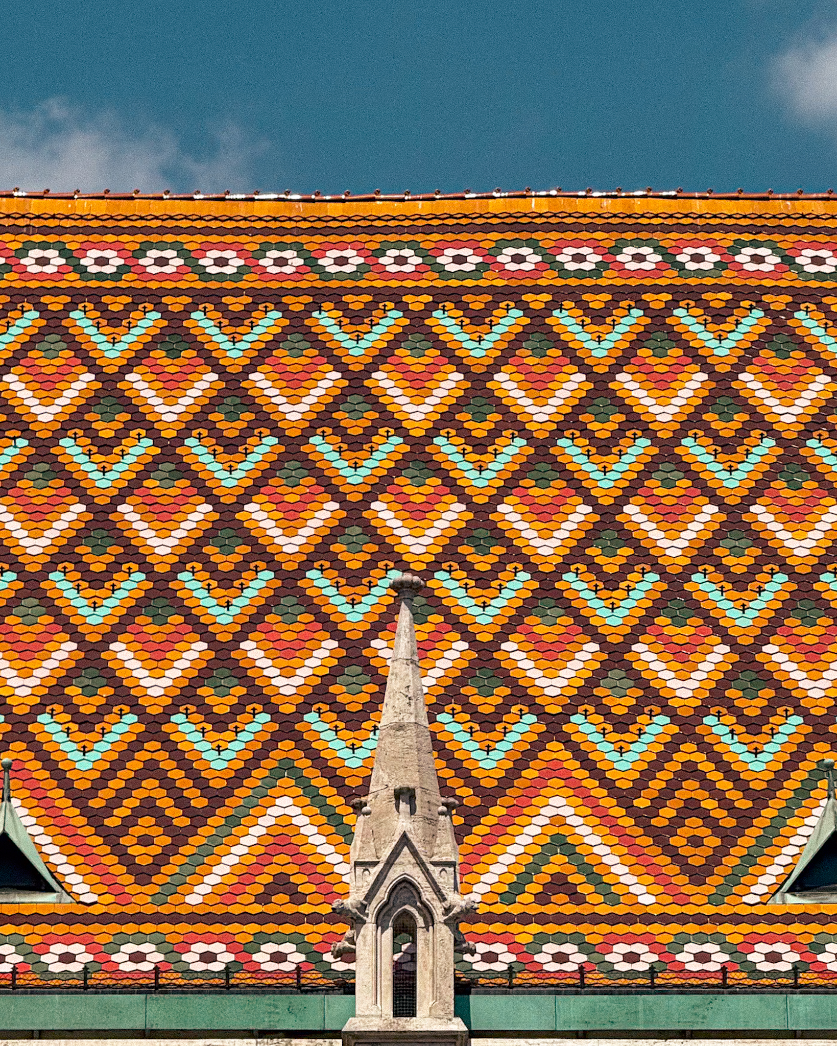 From a distance, the graceful architecture suggests a typical Gothic church with high turrets. As you grow nearer, your eye is drawn to the roof’s 250,000 uniquely colored tiles, telegraphing an entirely different establishment than assumed. Zoom even closer, and the pattern of these Zsolnay pyrogranite tiles may remind you of the design of a 1970s kitchen backsplash or a lanyard from summer camp. Visually, it’s a unique invitation to a singularly eclectic church.