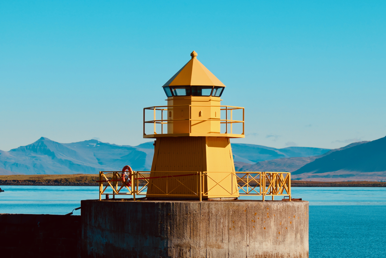 This semicircular-cylindrical light house guards a fishing village in Iceland.