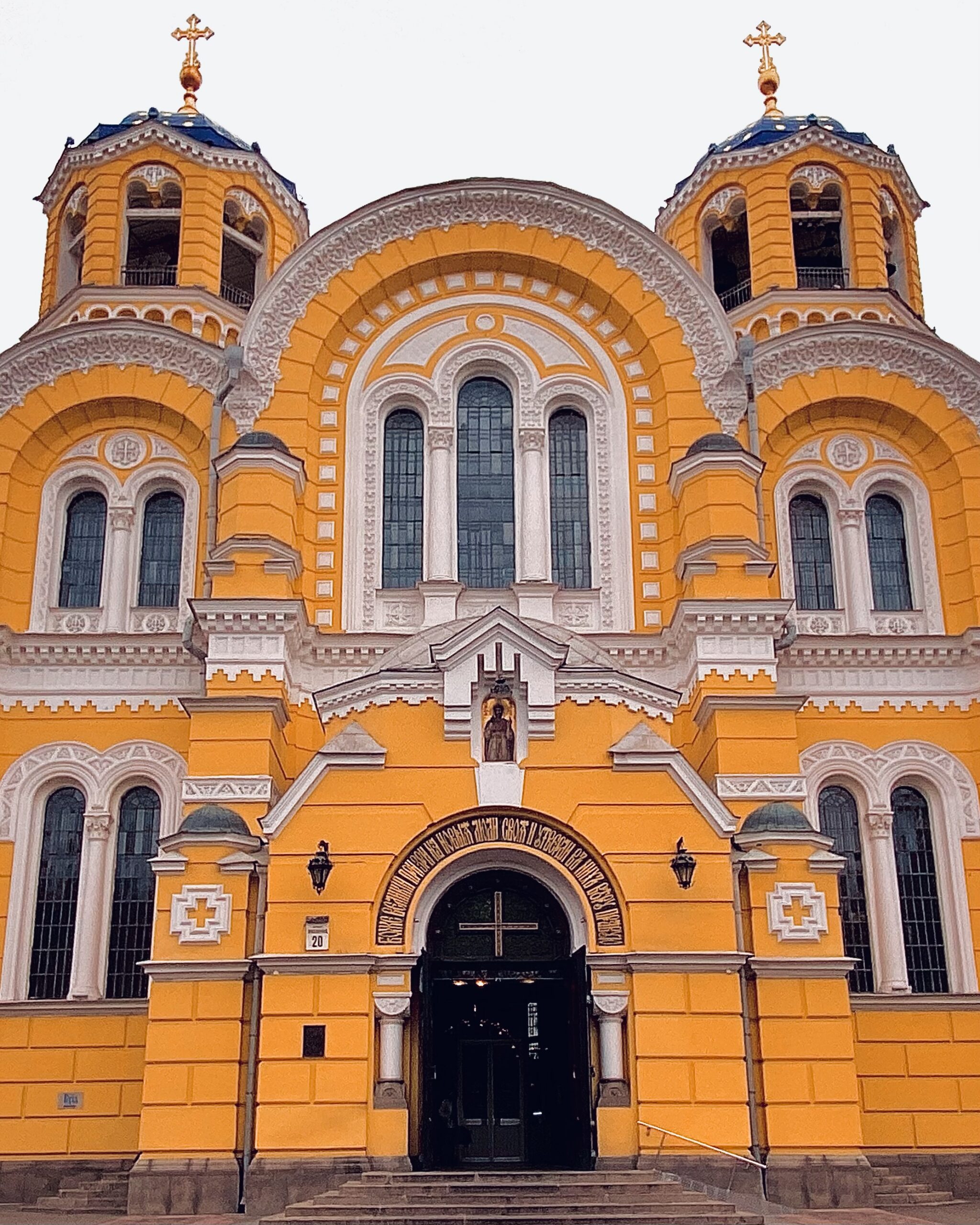 Golden like the morning sun cresting over the horizon, Saint Volodymyr Cathedral’s yellow façade and light grey domes are a landmark within Kyiv, Ukraine. Built to commemorate Saint Volodymyr who brought Christianity to the region, it has miraculously withstood four wars, and multiple threats of disassembly.