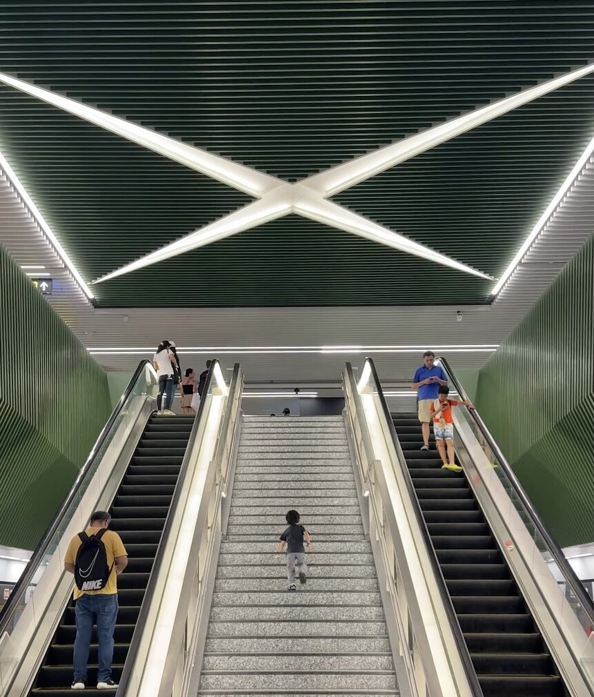The station’s green paneled interior resembles the trees of the beach and waves of the sea – a nod to the area’s history as a former seafront, now buried beneath the streets. Opened in June 2024, it’s one of the first MRT stations to have underground bicycle parking spaces with 364 bike parking lots – nearly one for every day of the year. Complete with specially designed stairs for wheeling bicycles up while you climb the steps, feel free to bring your wheels with you!