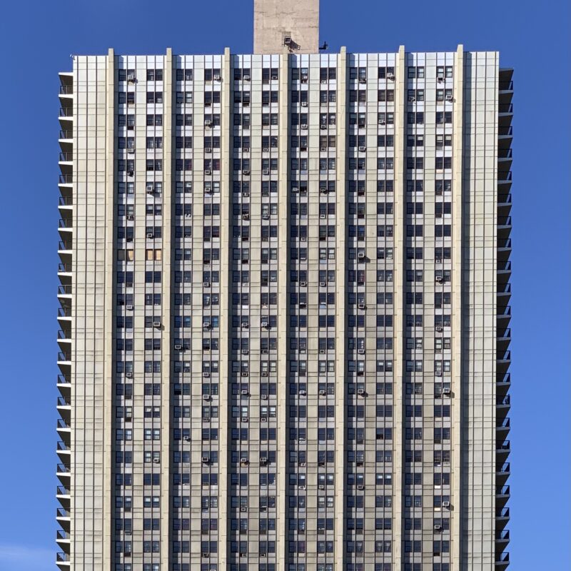 Four nearly identical towers sit atop one of the United States' busiest roadways at the approach of the George Washington Bridge in NYC.